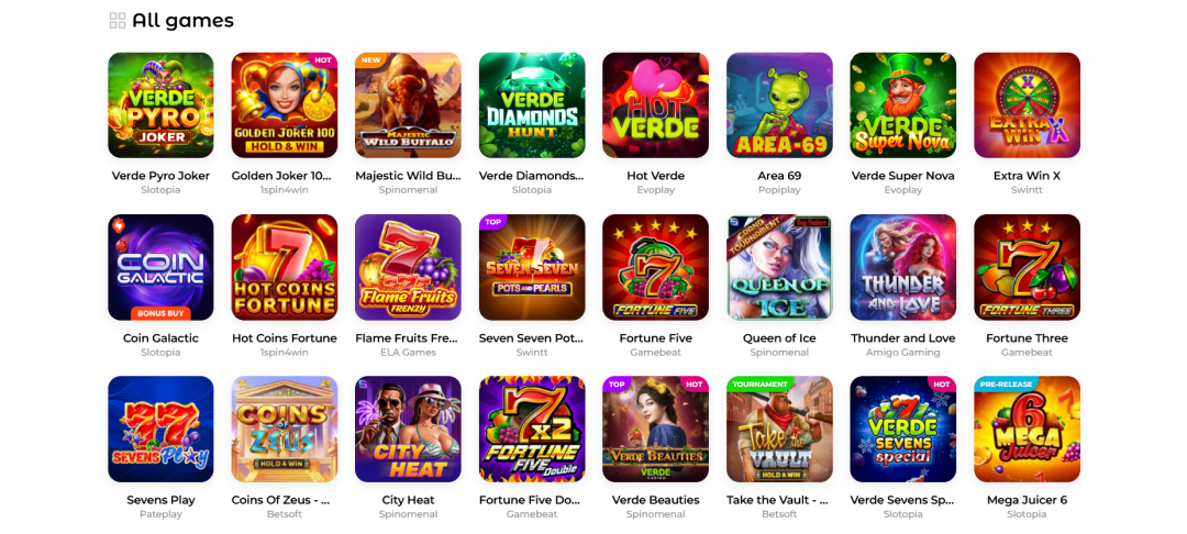 Verde casino má ve svém portfoliu více než 100 známých poskytovatelů herního softwaru, což zajišťuje rozmanitost a kvalitu her v každé kategorii. Hlavními partnery jsou Pragmatic Play, Evolution Gaming, NetEnt, Play’n GO, Red Tiger a na dalších. Díky síti těch nejlepších partnerů si u nás můžete užívat tisíce her od klasických automatů po moderní live casino hry.